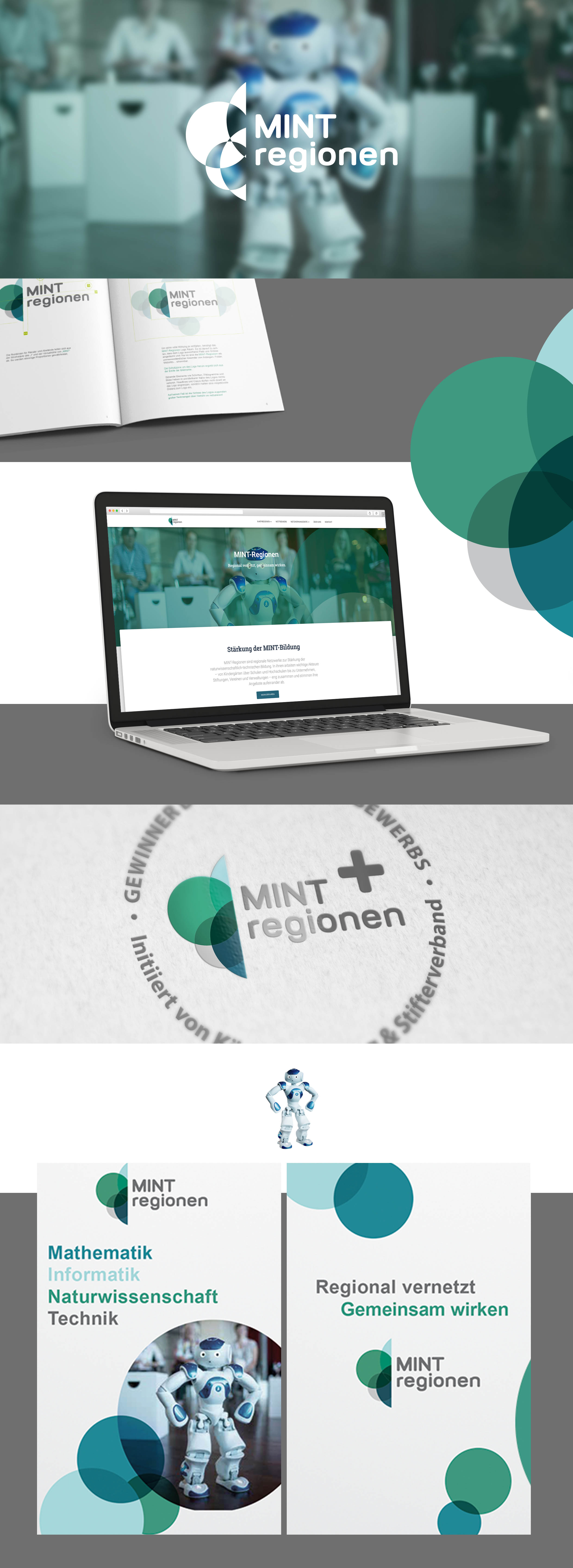 MINT-Regionen sind Netzwerke, die lokal passende, zentral koordinierte und nachhaltig wirksame Angebote entlang der Bildungskette in den MINT-Fächern (Mathematik, Informatik, Naturwissenschaften und Technik) vor Ort schaffen. In Deutschland gibt es über 80 regionale Netzwerke zur Stärkung der MINT-Bildung vor Ort. Für die MINTregionen wurde ein problemlos umsetzbares und adaptierbares Logo plus Corporate Design entwickelt. Das Erscheinungsbild der einzelnen Kommunikationsmittel fügt sich auf den ersten Blick zu einem schlüssigen Ganzen zusammen. Die Schmuckelemente, aus der Bildmarke des Logos entnommen, erlauben einen intuitiven, spielerischen Designprozess.